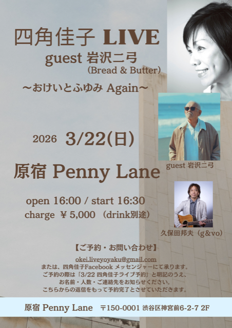 okei.liveyoyaku@gmail.com または 四角佳子のFacebookのメッセンジャーにて承ります。